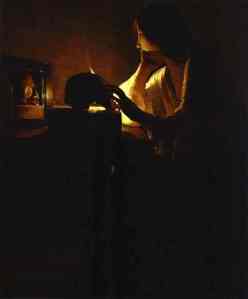 Jag tänker då på hur det var före elektricitetens tid. Och minns plötsligt Georges de la Tour. Jag tror det var Peter Englund som använde hans bilder för att bättre förstå det mörker som omgav 1600-talets människor. Det är lätt att begripa varför.