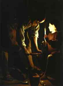 Jag kan nästan inte sluta titta på dessa bilder och på de människoansikten som ljuset lyser upp. Deras uttryck. Ofta är det koncenterade på något. Arbete eller spel eller ett barn. Ljuset finns där bara, som villkoret för att vi alls ska se dem. Det är naturligtvis en medveten religiös allegori. Bilden ovan föreställer till exempel en ung Jesus som hjälper pappa Josef i verkstaden. Men man kan också se den som en vardagsscen vilken som helst, från hur världen såg ut mörka kvällar under ett försvunnet 1600-tal.